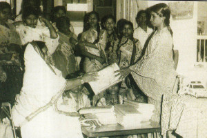 - Hon.Smt.Yashodharaji Bajaj donating books to women at Women Development Centre under ‘Praudh Shikshan Abhiyan’